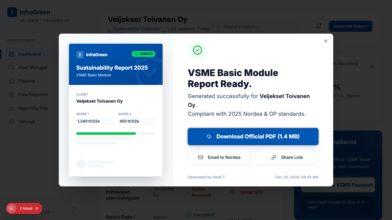 Auto-generate official VSME Basic Module reports for banking covenants. Stop manually filling Excel sheets for Nordea.